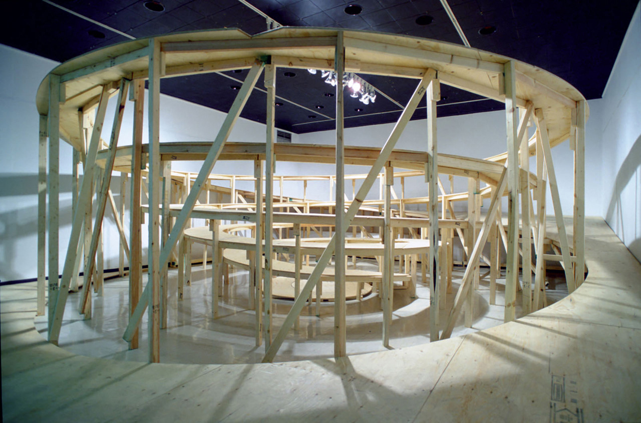 ‘Model for a Public Space’, an installation by Adrian Blackwell (originally titled ‘Spiral Space’), was exhibited in the Architecture II Gallery of the University of Manitoba (Winnipeg, Canada) in 1999. As Director of the Gallery, I secured a donation from a local lumber supplier and assisted Adrian Blackwell, together with exhibition co-curators Rob Kovitz and Eduardo Aquino, with construction and installation of the work. The piece was reinstalled later at Mercer Union in Toronto.