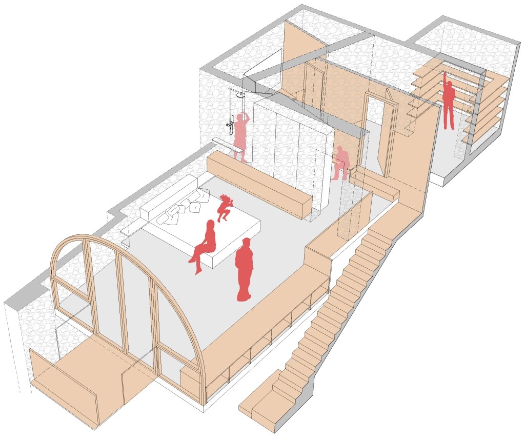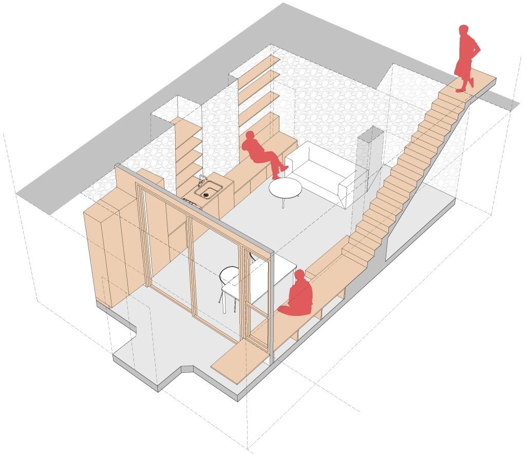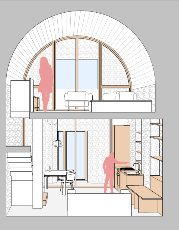 This adaptive reuse project involves converting an old stable in a rural village in southern France into a small apartment. The original construction is a tall space between party walls terminating with a barrel-vaulted ceiling that supports a house above and contains a mezzanine that was added later. Due to the steeply sloped terrain, which leaves the space semi-interred, the front facade –consisting of a doorway and a window above– is the only source of air and natural light. The main challenge of the project, then, was how to maximize daylight for the ground floor kitchen, dining, and living room. To this end, we propose a new glass facade receded one meter behind the stone facade, creating a double-height entrance porch that permits light entering the window above to also reach the ground floor below.