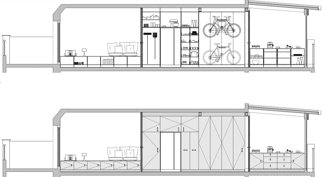 The renovation of this 1970s flat in Barcelona aims principally to reorganize the daytime spaces through the design of built-in furniture mainly for storage. The main piece runs along one of the flat’s party walls, unifying what were previously four separate rooms –entrance vestibule, kitchen, dining room, and living room– while at the same time meeting these spaces’ different storage needs. It replaces a corridor that previously skirted the kitchen, which is now open, larger, and contains more storage space, of which there seems to be never enough.