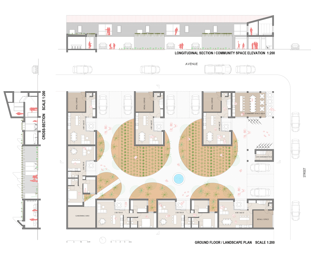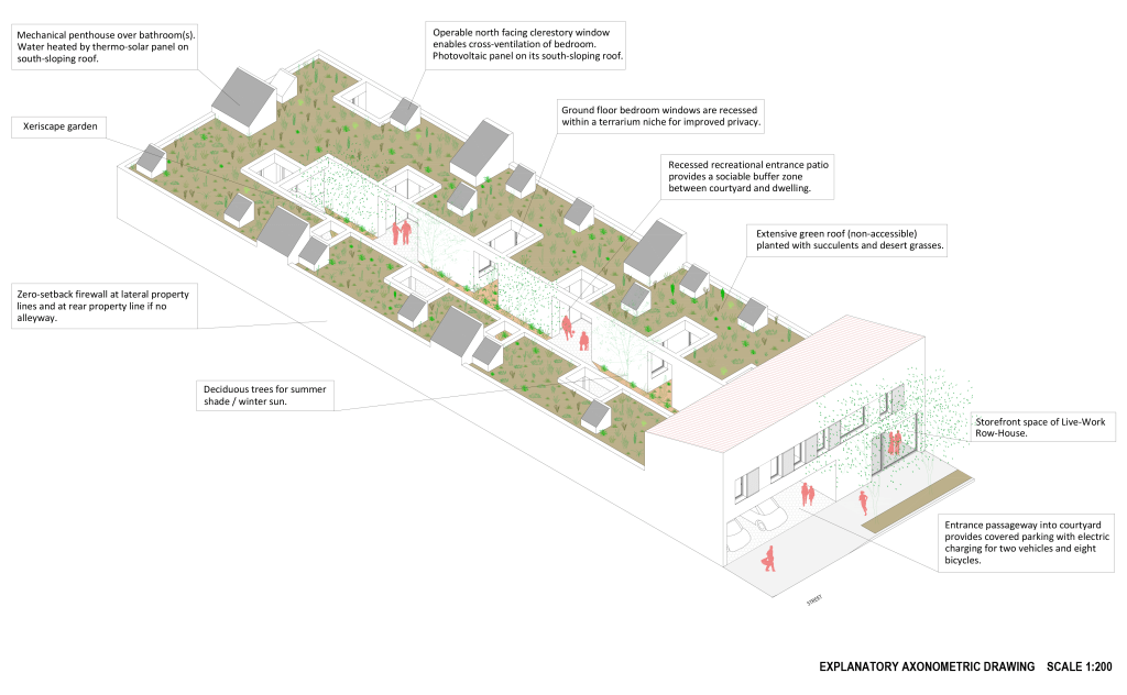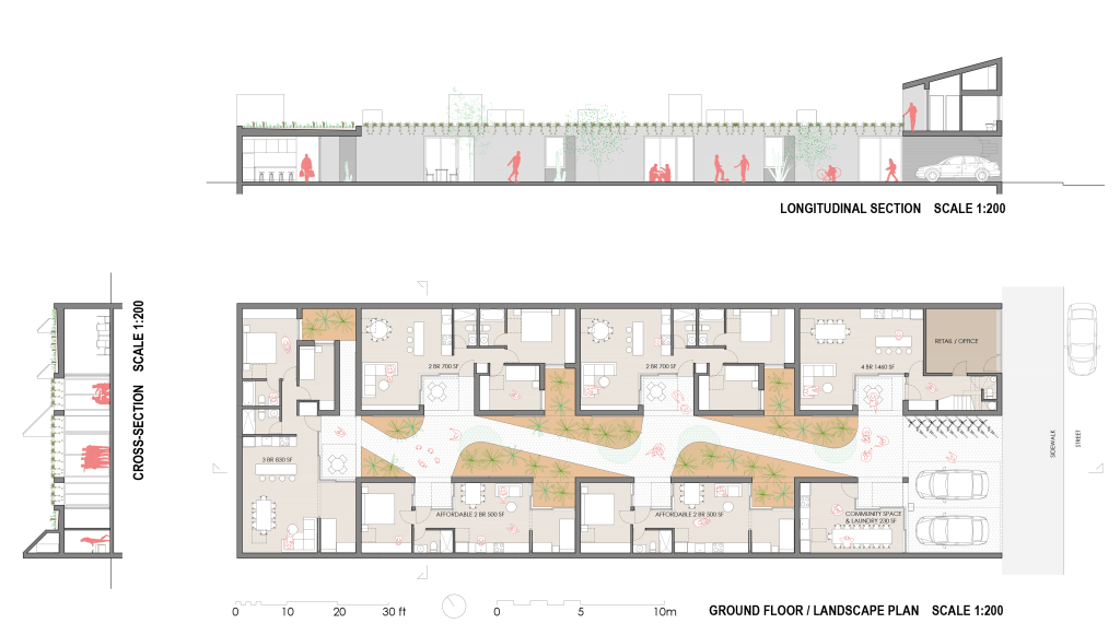 ‘City of Courts’ is a housing system that we designed and submitted to the Low-Rise LA Challenge, which solicited ideas for affordable ‘missing-middle housing’ for the City of Los Angeles, USA. Our scheme proposes infilling empty lots currently zoned for detached single-family houses with two-story zero-setback courtyard housing, i.e. attached multi-family instead of detached single-family. With this system change, a typical mid-block residential lot measuring 50′ x 150′ (approx. 15m x 45m) is able to accommodate up to 6 dwellings instead of one, including a large 4-bedroom live-work house with a ground-floor storefront space for a small business or for working at home. The system is also adaptable to larger 100′ x 150′ (30m x 45m) corner lots, which can accommodate up to 8 dwellings including four 4-BR units with storefront spaces. In the future, as single-family detached houses become a thing of the past, Los Angeles would gradually become a ‘City of Courts’. We wanted to demonstrate the higher urban densities –and affordabilities– that could be achieved with a low-rise housing system based on party walls (a.k.a. firewalls) and outdoor courtyards shared by small groups of neighbors. Needless to say, we didn’t win a prize.