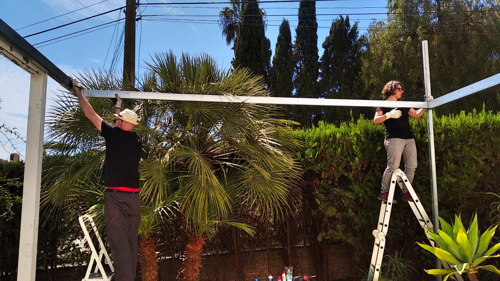This 4m x 4.2m demountable pergola was constructed by us in three days using a hollow structural section connection detail that hides all fasteners.