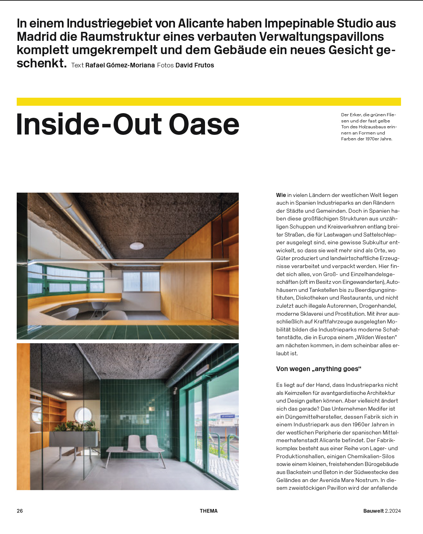 I have published a review of the refurbishment of the Medifer office building, a project by Impepinable Studio (Madrid) that is situated in an Alicante industrial park, in Bauwelt 2.2024.