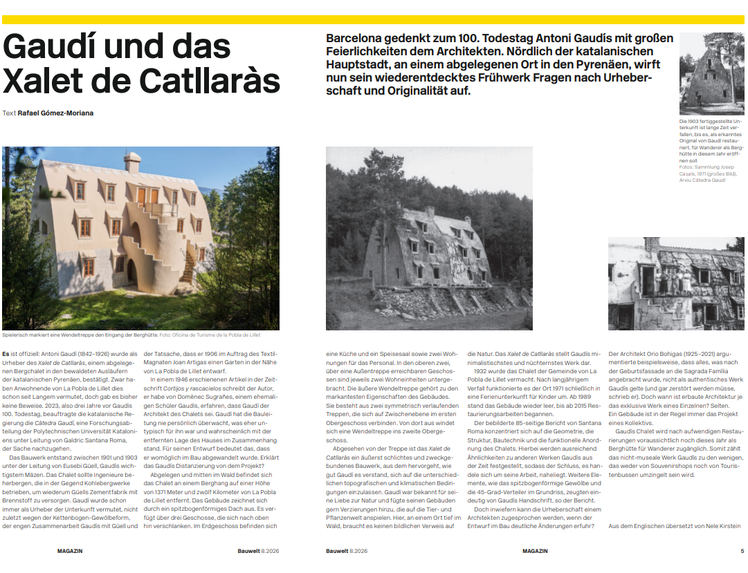 I have published an article on the certification of Antoni Gaudí’s authorship of the Xalet Catllaràs mountain hut in the German architecture magazine Bauwelt.